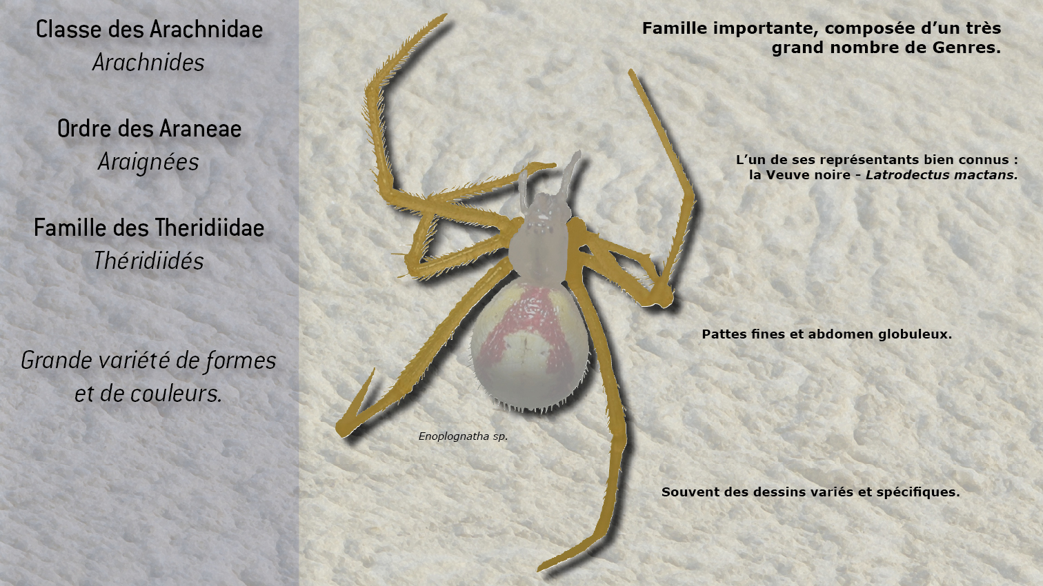 Famille très importante et comportant de nombreux genres. Les membres de cette famille possèdent une grande variété de formes et de couleurs. Les fils individuels de piégeage sont des brins de soie tendus et fixés au substrat. Beaucoup de Theridiidae tissent une nasse en trois dimensions, assez haut dans la végétation.