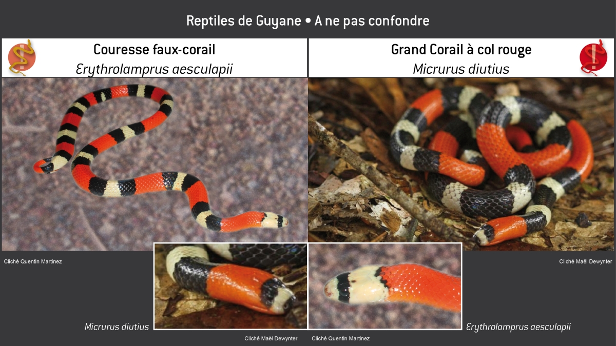 Le risque de confusion avec d'autres espèces Guyanaises se limite à la forme "typique" de Erythrolamprus aesculapii - (Couresse faux-corail) qui lui est clairement mimétique. Le détail de placement des anneaux doit être étudié pour distinguer les deux espèces. La prudence est donc de rigueur dans l'identification pour éviter tout risque d'accident !