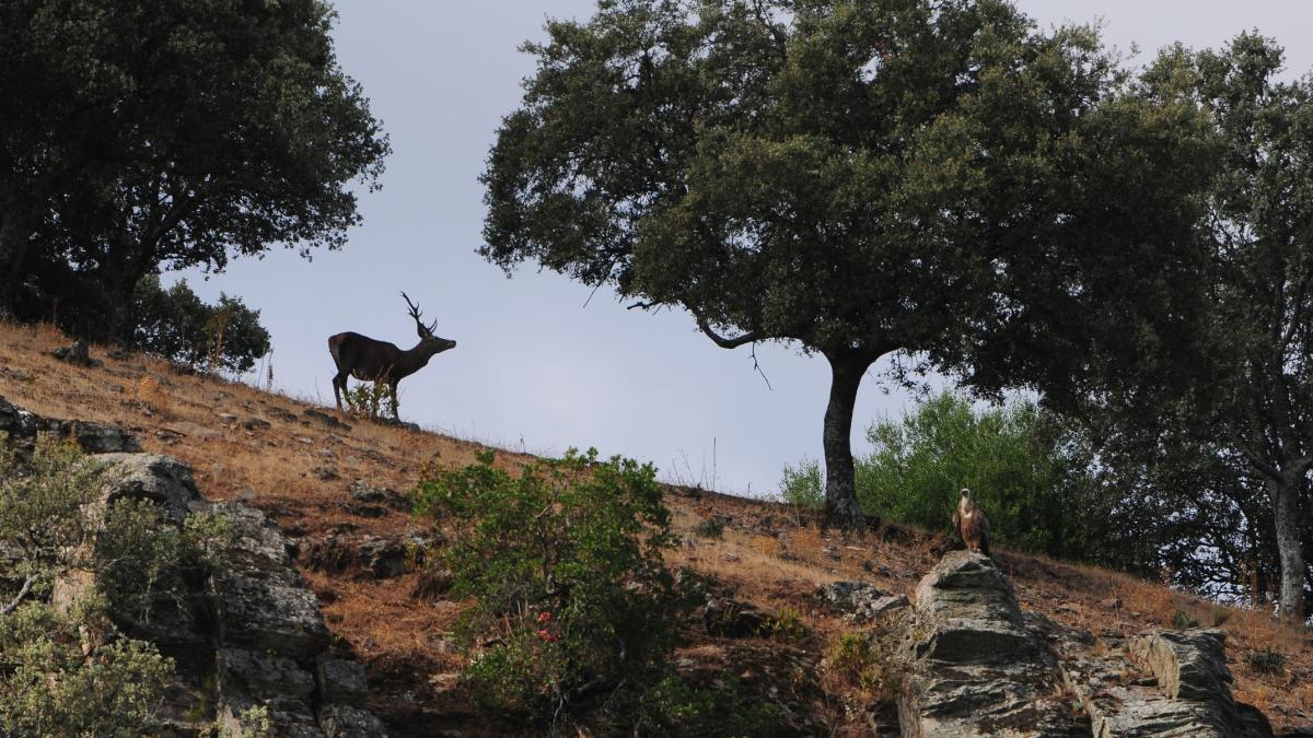Un Cerf d'Espagne (Cervus elaphus ssp. hispanicus) qui cherche à s'accaparer quelques feuilles de chènes, absolument pas perturbé par la présence d'un Vautour fauve (Gyps fulvus) posé à proximité. En vérité, il n'a clairement rien à craindre…