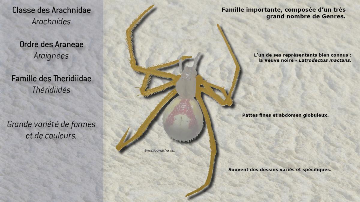 Famille très importante et comportant de nombreux genres. Les membres de cette famille possèdent une grande variété de formes et de couleurs. Les fils individuels de piégeage sont des brins de soie tendus et fixés au substrat. Beaucoup de Theridiidae tissent une nasse en trois dimensions, assez haut dans la végétation.