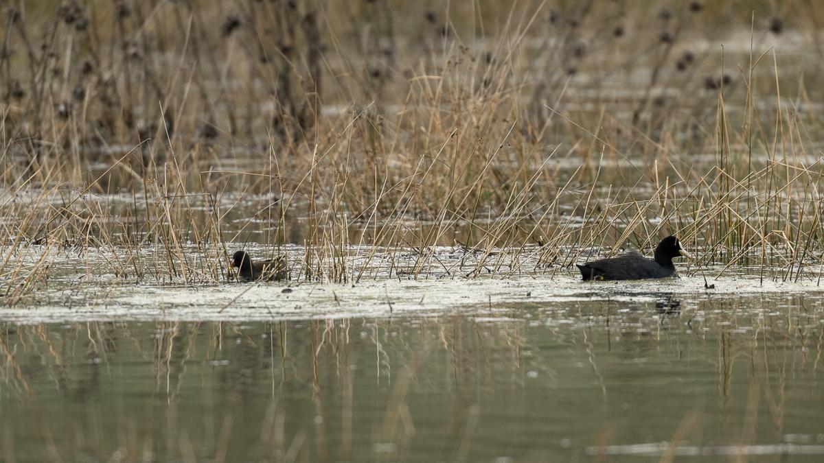 Foulque macroule - (Fulica atra), ici en compagnie d'une Gallinule Poule d'eau - (Gallinula chloropus).