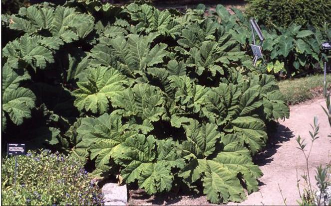Cette plante originaire des zones humides du Chili et d’Argentine est spectaculaire pour ses feuilles à l’aspect froissé mesurant jusqu’à 1,50 m de diamètre dans la nature. Elles sont portées par de longs pétioles. Les dessous des feuilles ainsi que les pétioles sont hérissés de verrues pointues. Cette plante fleurit entre novembre et décembre dans sa région d’origine (en mai-juin au Jardin botanique). Son inflorescence volumineuse apparait à la base des feuilles.