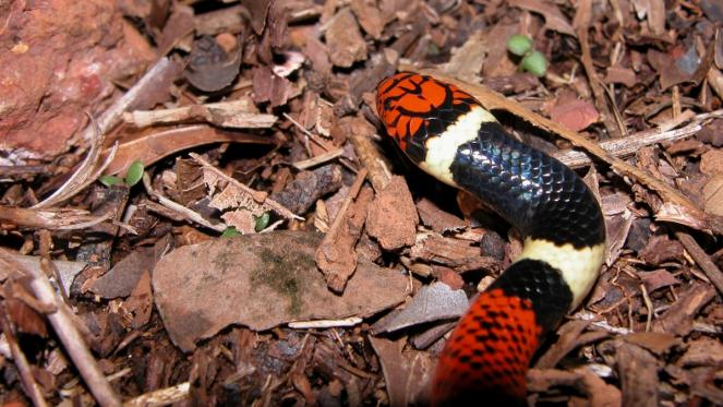 Micrurus surinamensis (Serpent corail à tête rouge).