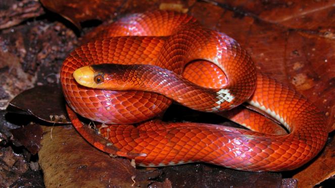 Étonnant serpent que cet Oxyrhopus formosus. Ses écailles couleur feu lui donnent une étrange allure, une beauté presque hypnotisante.
