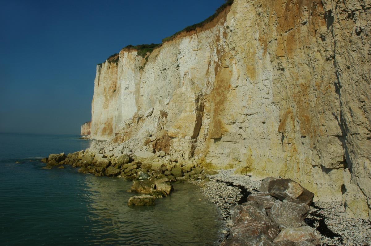 La base des falaises de tout le littoral est frappée continuellement par les marées et assaillie par les vagues d'une mer qui n'est pas toujours aussi clémente que sur cette photo.