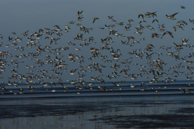 Vol de limicoles en période migratoire (Bécasseaux sanderling et variable)