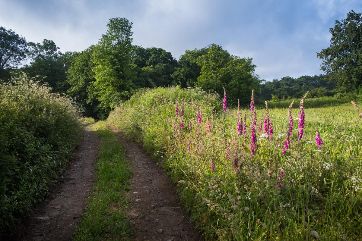 Un beau sentier, bordé de talus fleuris, à l'approche du Val Hervelin, commune de Pleudihen-sur-Rance.